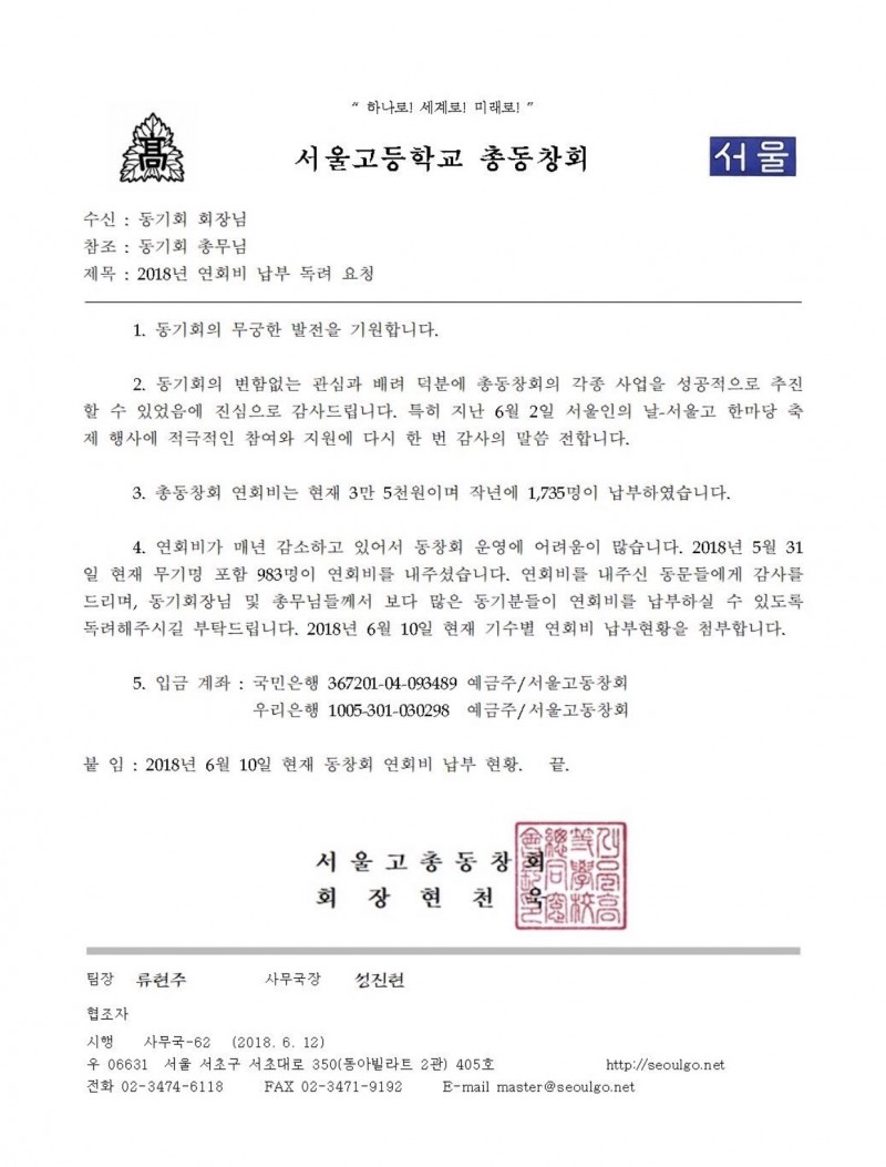 총동창회 연회비납부에 관련된 서한을 밑에 붙입니다