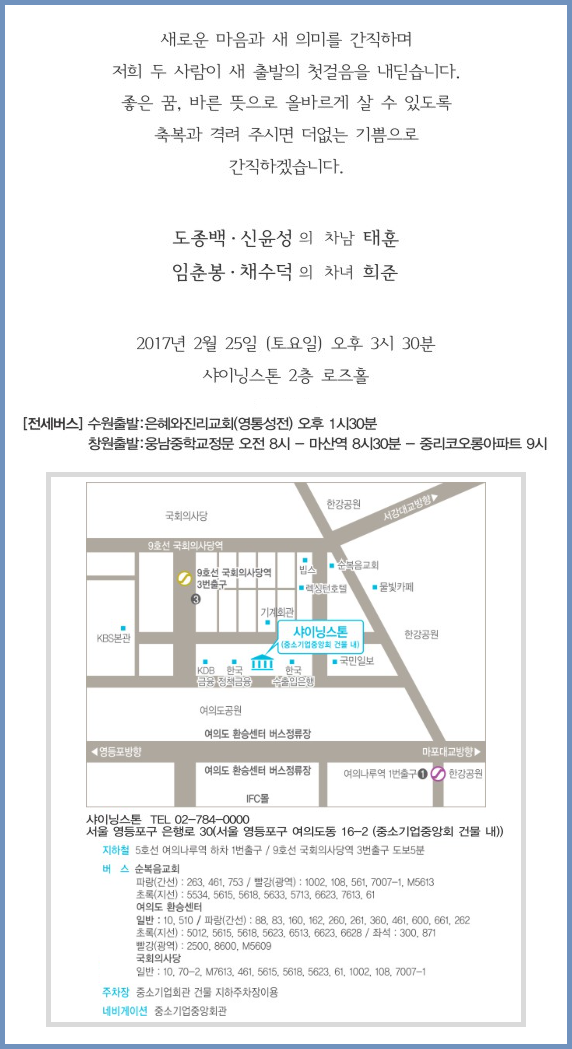 祝혼인-임춘봉학우의 둘쨋따님 희준孃 페이지 정보 임충빈 작성일17-02-05 17:41 조회2,050회 댓글0건 목록 본문 따님의 혼인을 축하합니다. 일시: 2017년 2월25일(토) 오후 3시 30분 장소: 샤이닝스톤 로즈홀(중소기업중앙회관 2층) 댓글목록 목록