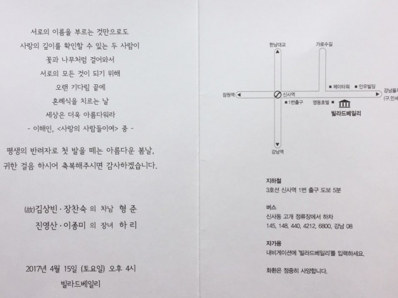 [祝혼인]진영산의 장녀 하리孃-4월 15일(토)오후4시 페이지 정보 임충빈 작성일17-03-17 08:44 조회2,169회 댓글0건 목록 본문 진영산宅에 경사가 있습니다. 축하합니다. 일시: 2017년 4월 15일(토) 오후 4시 장소: 빌라드베일리 (3호선 신사역 1번출구에서 도보로 5분) 댓글목록 목록