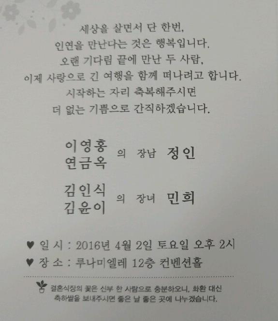 축 결혼-김인식 차녀,4월2일(토)2시,루나미엘레12층컨벤션홀(9호선국회의사당역3번출구둘째길좌회전)
