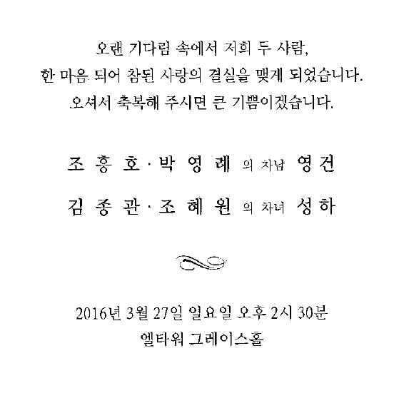 축 결혼 - 김종관 차녀, 3월27일(일)2시30분,엘타워 그레이스홀 (신분당선 양재역 9번출구 앞)