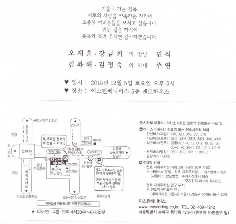 축 결혼 - 오재훈 장남, 12월5일(토) 5시, 이스턴베니비스 5층(5,8호선 천호역10번출구 바로 앞)