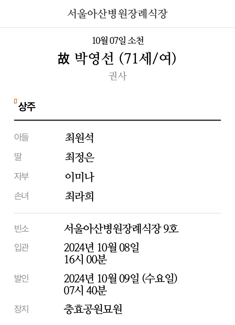 - 빈소: 서울아산병원장례식장 9호(풍납동)