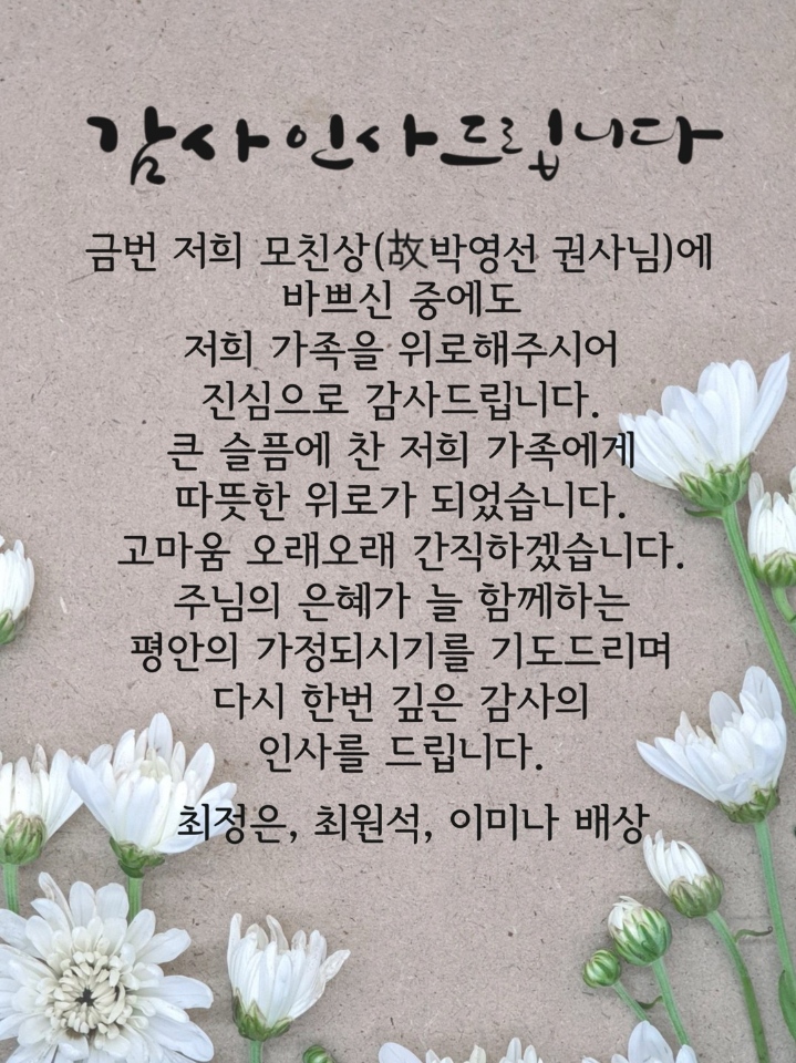 故최봉준의 맏딸 정은이가 감사편지를 보내 왔습니다