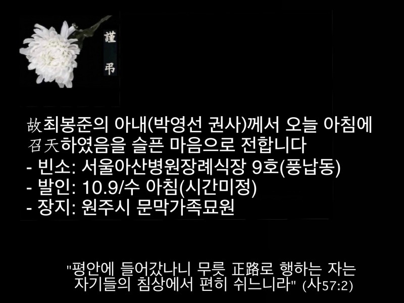 故최봉준의 아내(박영선 권사)께서 오늘 아침에 召天하였음을 슬픈 마음으로 전합니다