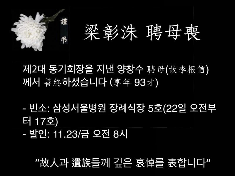 제2대 동기회장을 지낸 양창수의 聘母(故李根信)께서 善終하셨습니다 (享年 93才)