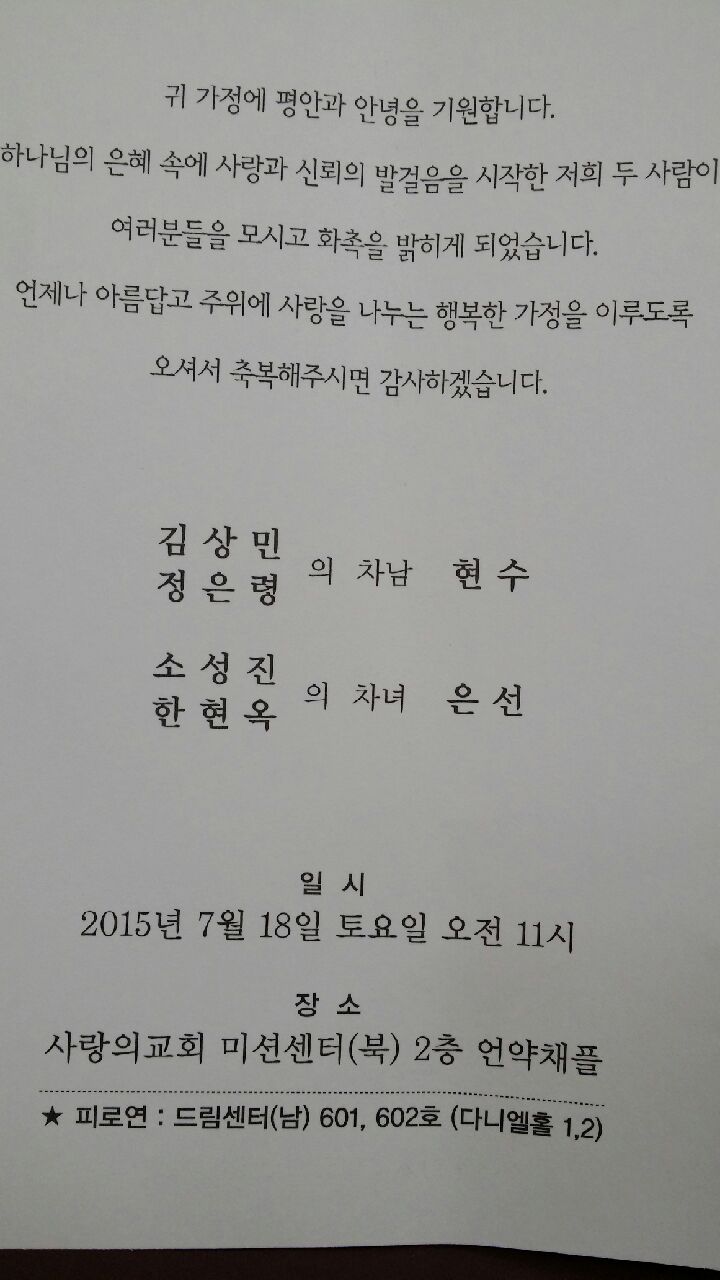 축 결혼 - 소성진 차녀, 7월18일(토)11시,사랑의교회 미션센터(북)2층 언약채플,서초역3,4번출구