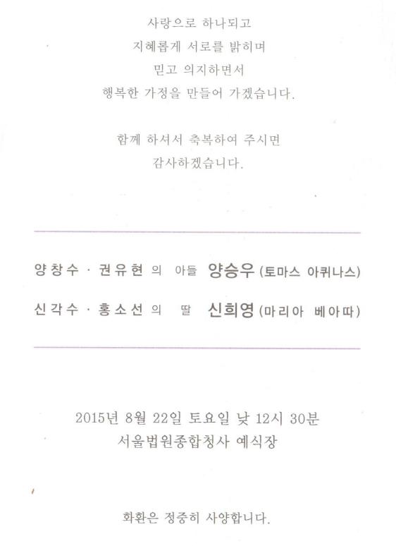 축 결혼 - 양창수 장남, 8월22일(토)12시30분, 서울법원종합청사예식장(2,3호선 교대역11번출구직진)