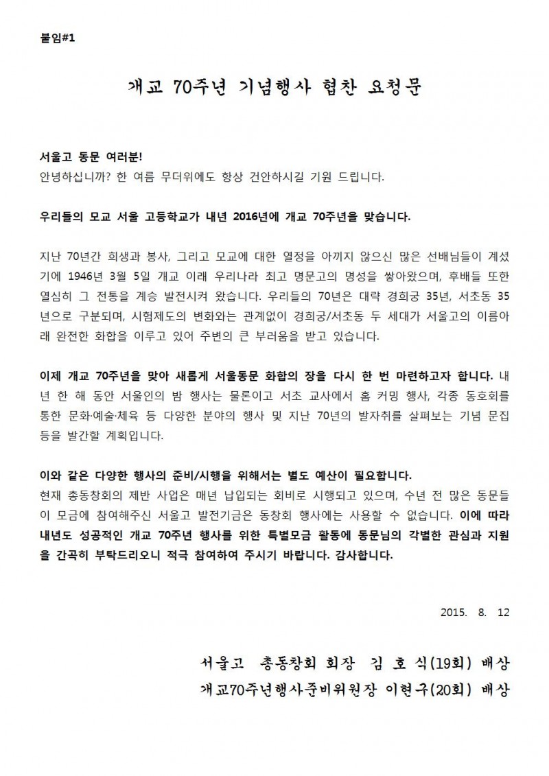 1. 내년(2016년)은 서울고 개교70주년이 되는 해입니다.