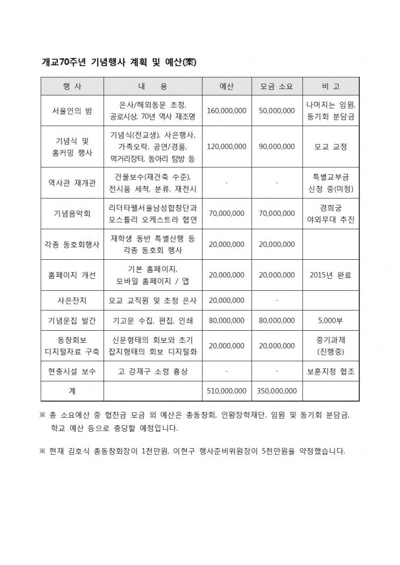 총동창회로부터 기념행사 비용 관련 모금 협찬 요청이 있어서 안내하여 드립니다.