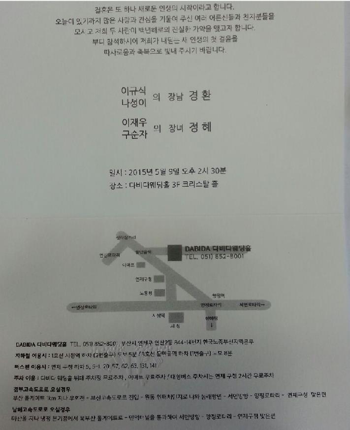 축 결혼 - 이규식 장남, 5월9일(토)2시30분, 다비다웨딩홀(한국노총부산지역본부내,부산,051-852-8001)