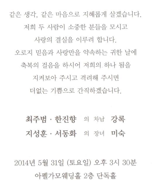 축 결혼 - 지성훈 장녀, 5월31일(토) 3시30분, 아펠가모웨딩홀 2층 단독홀(잠실역 7번출구 부근)
