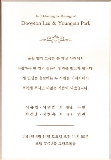 축 결혼 - 유영제 장남, 6월14일(토)11시, 서울대학교 교수회관(서울대학교 구내)