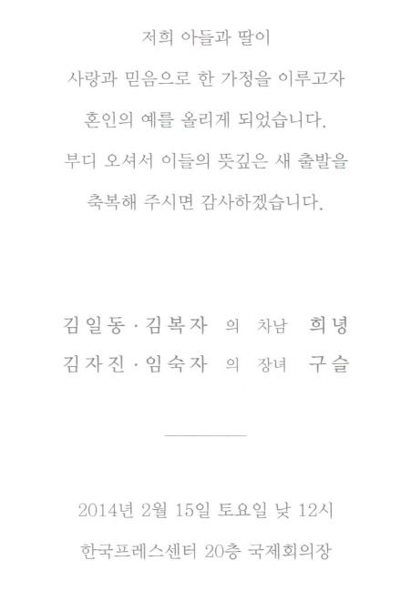 축 결혼 - 김일동 차남, 2월15일(토)12시, 프레스쎈터(1,2호선 시청역4번출구 연결)