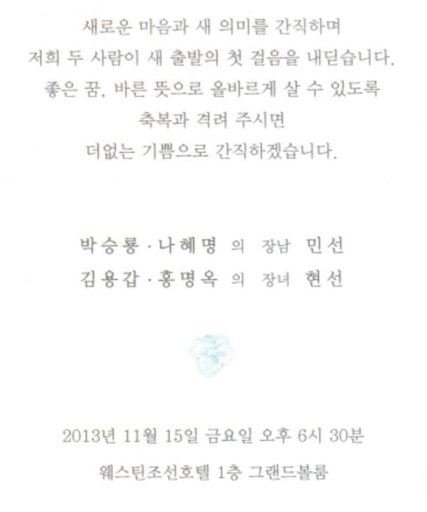 결혼 알림 - 박승룡 장남, 11월15일(금) 6시30분, 웨스틴 조선호텔(1,2호선 시청역 6번출구 300m)