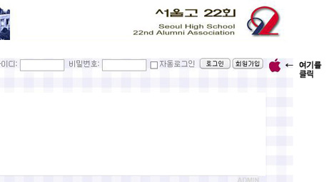 - 아이폰이나 아이패드로 동기회 홈페이지 접속시에는 첫페이지 우측 상단(로그인 버튼 옆)에 애플 모양을 클릭