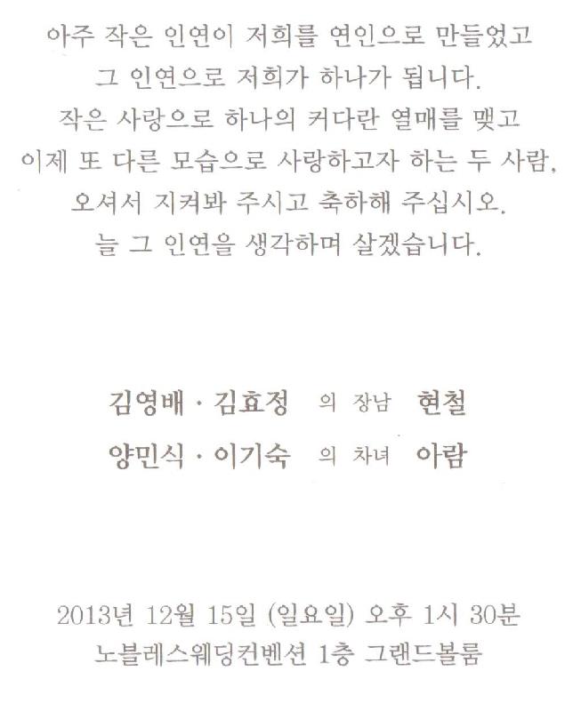 결혼 알림 - 양민식 차녀, 12월15일(일) 1시30분, 노블레스웨딩컨벤션(3호선 남부터미널역 4번출구 앞)