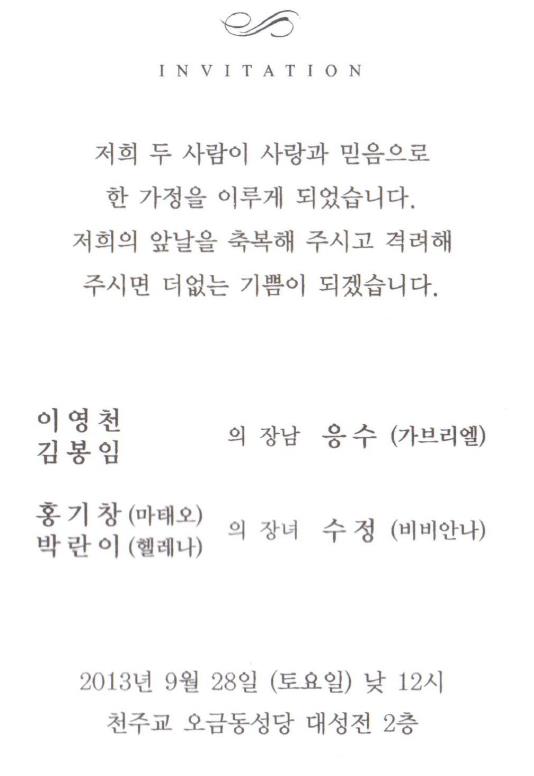결혼 알림 - 홍기창 장녀 결혼, 9월28일(토) 12시, 오금동 성당2층(5호선 방이역 1번출구 500m)