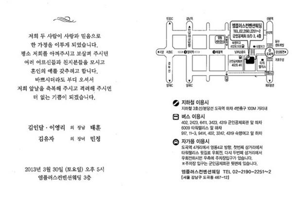 결혼 알림 - 김인달 장남, 3월30일(토) 5시, 엠플러스컨벤션웨딩 3층(3호선 도곡역 4번출구 100m)
