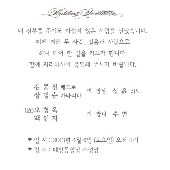결혼 알림 - 김종진 장남, 4월6일(토) 11시, 대방동성당 소성당, 7호선 보라매역 도보 10분