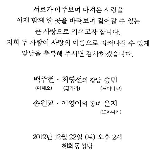 결혼 알림 - 손원교 장녀, 12월22일(토) 2시, 혜화동 성당(4호선 혜화역1번출구 도보5분)