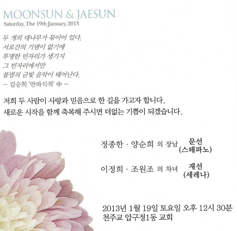 결혼 알림 - 이정희 차녀, 1월19일(토) 12시 30분, 천주교 압구정1동교회 ( 3호선 압구정역 2번출구 부근)