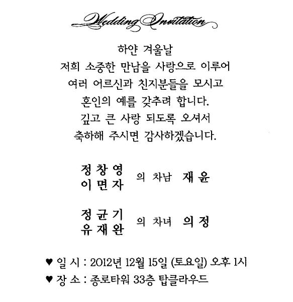 결혼알림 - 정균기 차녀,12월15일(토)1시, 종로타워33층 탑클라우드(1호선 종각역3번출구 도보1분)
