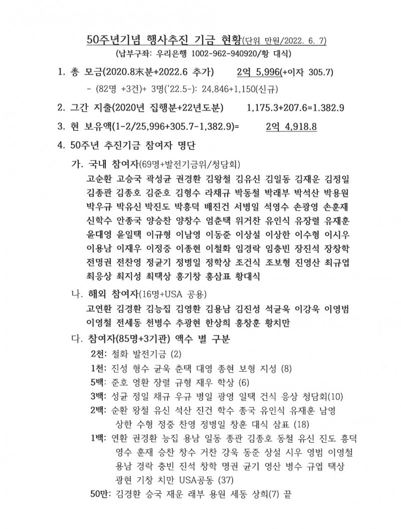 50주년 기념행사는 보다 많은 분의 참여를 통해 추진 되는것이 바람직할 것입니다. (그간 85명 참여: 명단 下添) 마침 이번 기념문집에 '50주년 기념행사 추진기금' 참여자 명단을 게재할 예정 인데, 그간 모금활동 不在로 아직 참여하지 못 하신 분을 위해 아래 구좌를 알려드리니 기금참여를 원하시는 분은 가능한 6.17까지 보내주시기 바랍니다. (우리 1002-962- 940920/황대식)