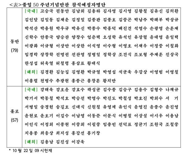 졸업50주년을 기념하기 위해 아래와 같이 만찬회를 개최하오니, 부디 왕림하셔서 뜻깊은 자리를 함께해 주시기 바랍니다 (同夫人 환영)