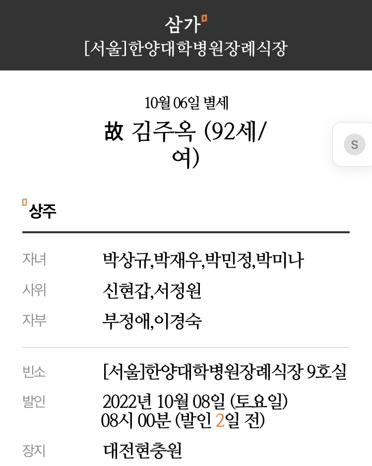 朴尙奎 母親(故김주옥)께서 오늘 10월 6일(목) 享年 92歲를 一期로 별세하셨습니다.