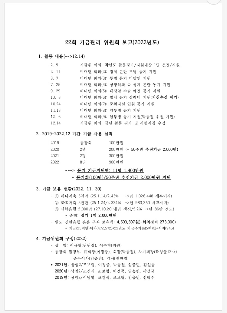 2022년도 기금관리위원회 (보고) 페이지 정보 임충빈 작성일22-12-14 16:51 조회433회 댓글0건 목록 본문 2022년도 기금관리위원회 운영내역을 아래와 같이 보고합니다 기금관리위원장 이 규 형 댓글목록 목록