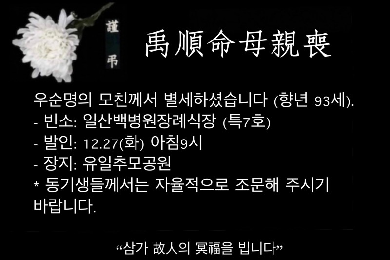 * 동기생께서는 자율적으로 조문해 주시길 바랍니다. (참고로, 우순명 부부는 사정상 빈소를 지키지 못한다고 합니다.)