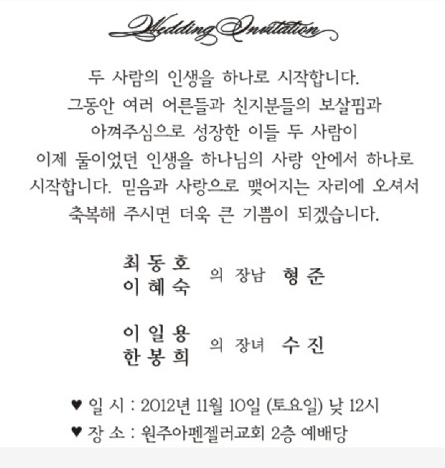 결혼 알림 - 최동호 장남, 11월10일(토)12시, 원주 아펜젤러교회2층 예배당