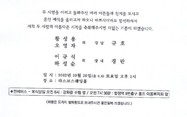결혼 알림 - 이규식 장녀, 10월20일(토)2시, 라스코스웨딩홀(부산,051-758-3337) 07:30합정역출발버스