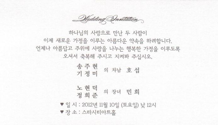 결혼 알림 - 노현덕 장녀, 11월10일(토) 12시, 스타씨티아트홀 웨딩(2호선 건대입구역2번출구)