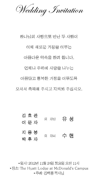결혼 알림-지용붕 차녀,11월24일(토)11시(현지시간),Tha Hyatt Lodge at McDonald Campus(미국 …