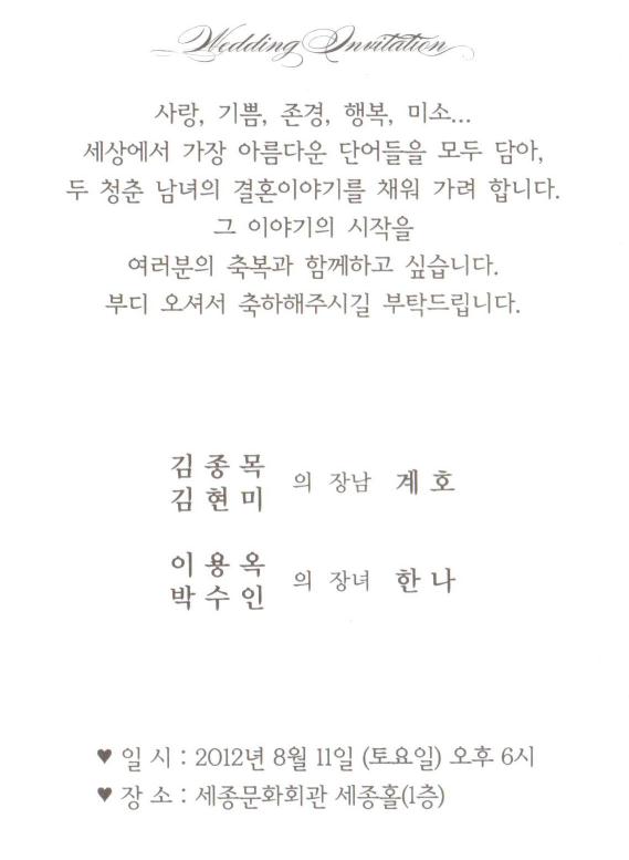 결혼 알림- 김종목 장남, 8월11일(토) 6시, 세종문화회관1층 세종홀(5호선광화문역 8번출구)