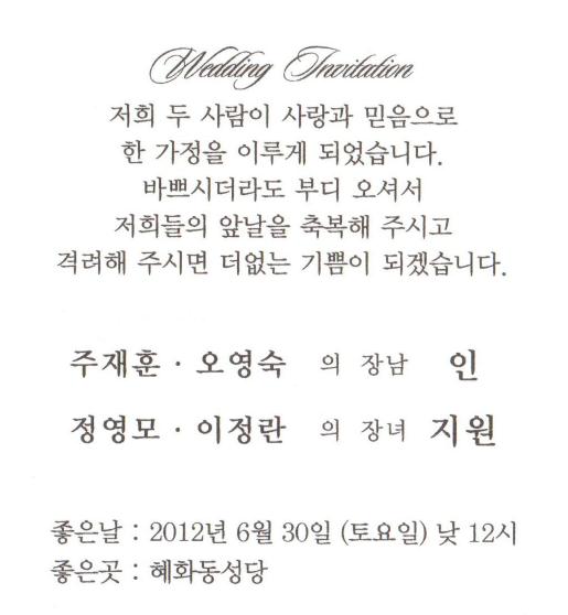결혼 알림 - 주재훈 장남, 6월30일(토)12시, 혜화동 성당(혜화역1번출구 도보5분)