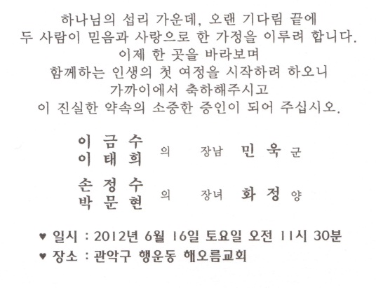 결혼 알림 - 손정수 장녀, 6월16일(토) 11시30분, 해오름교회(관악구 행운동),낙성대역8번출구320m