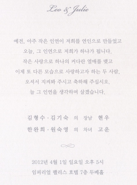 결혼 알림 - 김형수 장남 결혼, 4월1일(일)5시, 임페리얼팰리스호텔 7층 두베홀