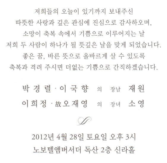결혼 알림 - 이희정 장녀 결혼, 4월28일(토)3시, 노보텔 앰버서더 독산 2층,독산역1번출구900m