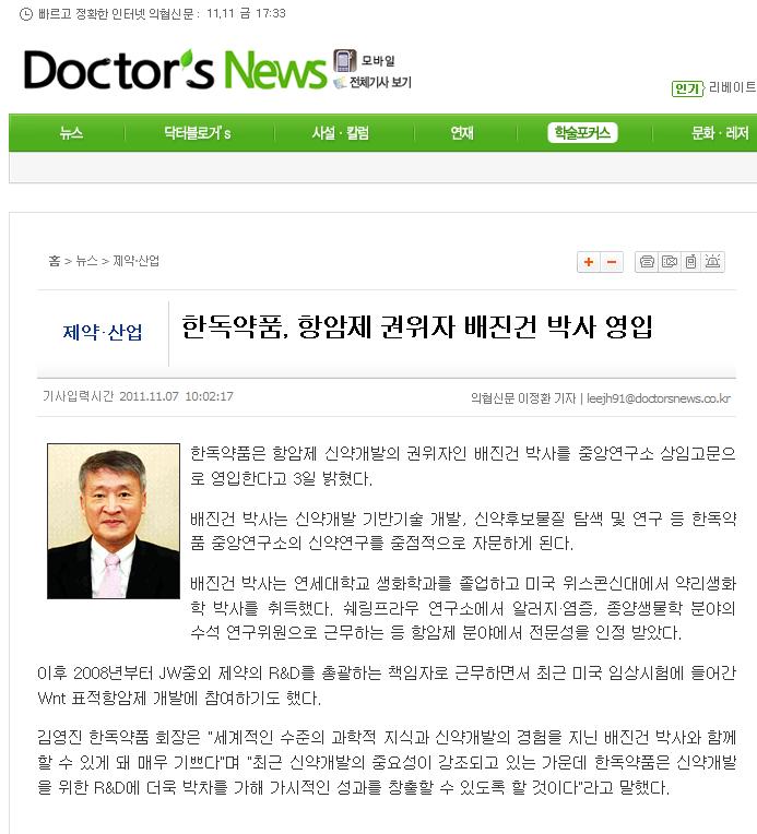 축- 배진건 박사 한독약품 상임고문에 취임