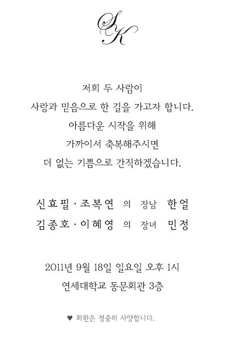 청첩 - 김종호 장녀결혼, 9월18일(일)1시, 연세대학교 동문회관 3층
