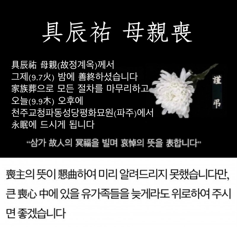 [謹弔]具辰祐母親喪 페이지 정보 임충빈 작성일21-09-09 11:01 조회992회 댓글0건 목록 본문 삼가 哀悼의 뜻을 表하며, 어떤 말로도 위로가 되진 않겠지만 어머님의 명복을 진심으로 빌겠습니다. 댓글목록 목록