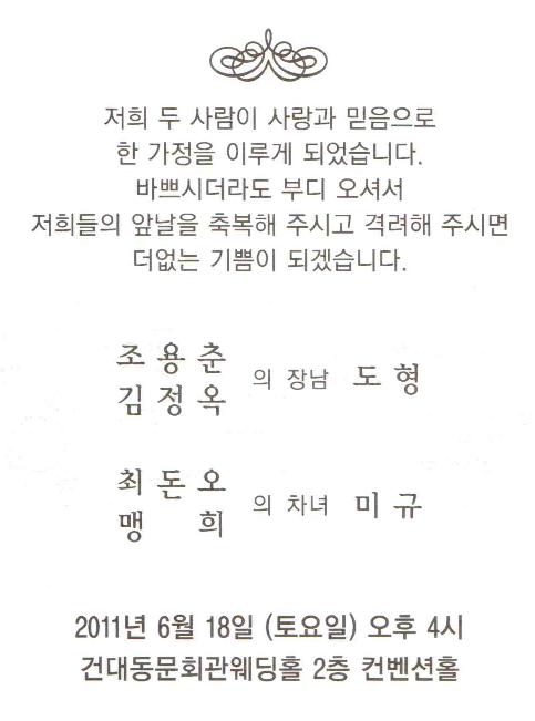 청첩 - 최돈오 차녀 결혼, 6월18일(토) 4시, 건대동문회관웨딩홀2층(건대역5번출구 도보3분)