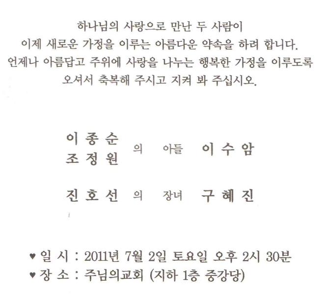 청첩 - 이종순 영식결혼, 7월2일(토) 2시30분, 주님의교회(정신여고내, 잠실종합운동장역3번출구)