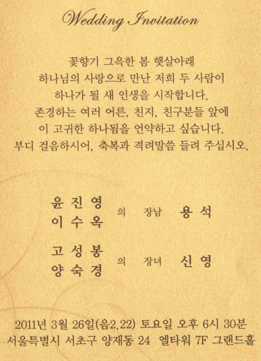 청첩 - 윤진영 장남 결혼, 3월26일(토) 6시30분, 엘타워7층(양재역7번출구 직진)