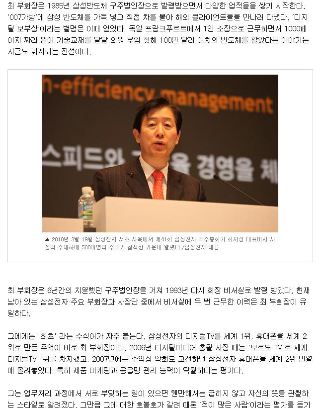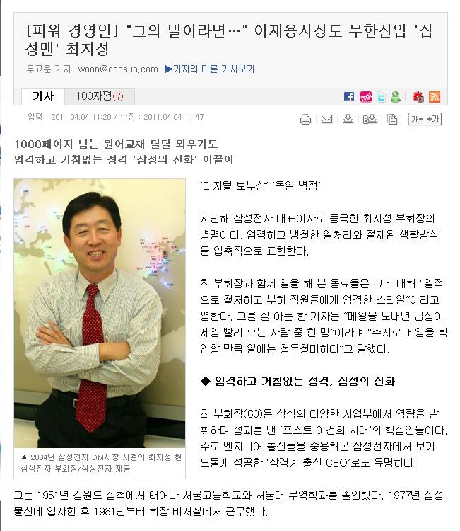 그의 말이라면…" 이재용사장도 무한신임 '삼성맨' 최지성 -조선일보에서 발췌