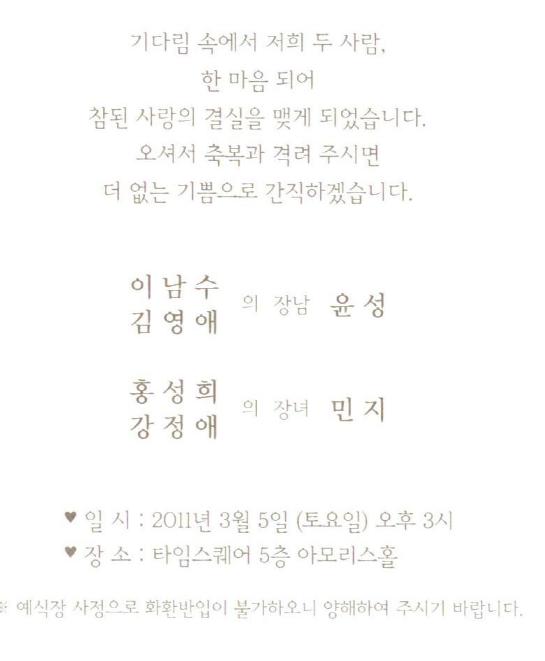 청첩 - 고 정성화 차남 결혼, 2월12일(토)11시, 메모리스 4층(선릉역4번출구부근)