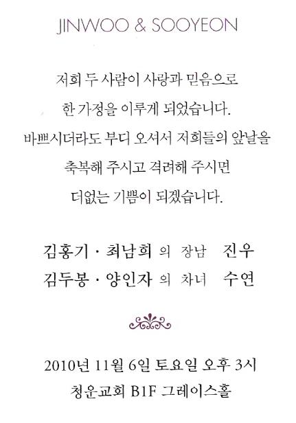 청첩 - 김홍기 장남 결혼, 11월6일(토) 3시, 청운교회(도곡동 강남세브란스병원 건너편)